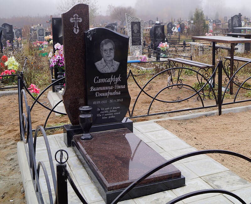 Стандартный комплект памятника включает в себя стелу, подставку и цветник. Плитка приобретается по желанию заказчика и за отдельную плату. Вместо цветника можно установить надгробную плиту.